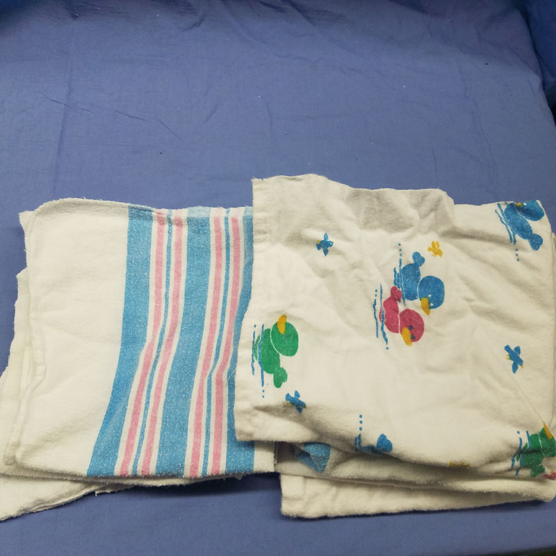 Recycled bed sheets and pillow cases, laundered. Cut into generous sizes. Very economical. Very absorbent. Minimal lint.